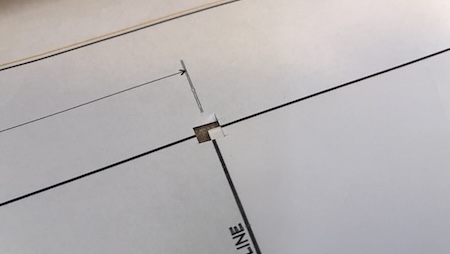 Then by cutting a small hole in the plans at the ends and intersection of the centerline and baseline, I was able to align the lines on the plans to the straight factory edges of the poster board underneath.
