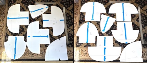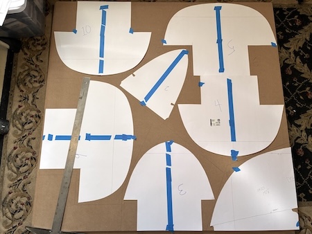 After roughly blocking out two 4 ft. x 4 ft. areas on the floor, I maneuvered the patterns around until I was able to find an arrangement that would efficiently fit them all onto one 4' x 8' sheet of plywood.