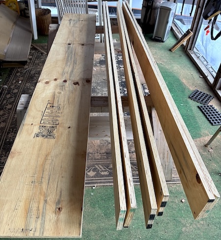 To make the two 12-foot long sides of the frame, I had the lumber yard cut six, 5-1/2" x 8' strips from a 4'x8' sheet of 3/4" CDX plywood. (I'll rip the remaining piece to use as shelves along both sides of the strongback)