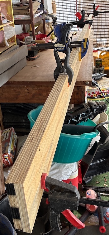 I cut two of the strips in half to make four 4-foot sections, then laminated an 8' and a 4' section to 4' and 8' section to make a 1-1/2" x 5-1/2" x 12' long beam.