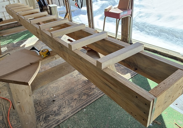 I repeated that process to make the other side beam then joined them with 12" scrap 2 x 6s at each end and some spacer/braces along the center.