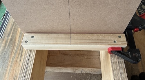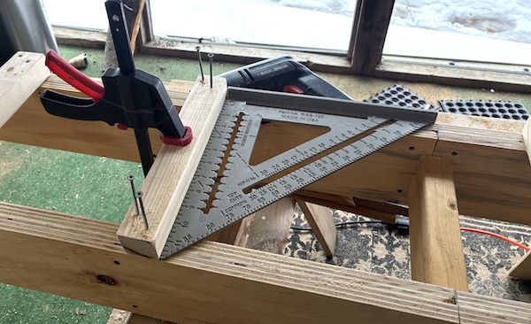 After ensuring the sawhorses and strongback were level, I secured them to each other and to the floor then began permanently attaching the components. All were checked and double-checked for squareness and plumb.