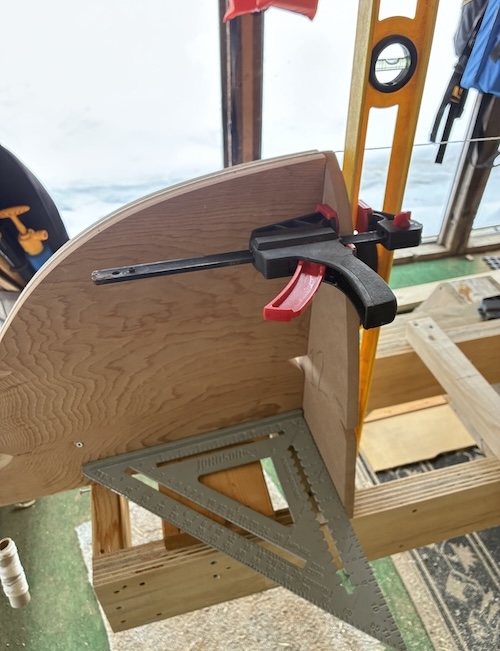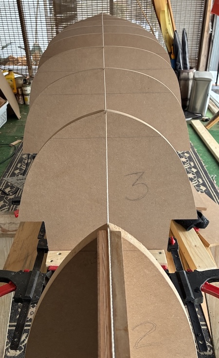 Then the stem form at each end was squared up and attached with screws through the adjacent station form and angled into the strongback.