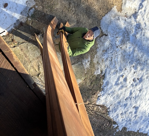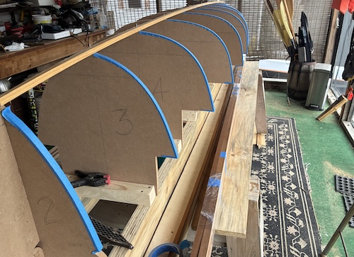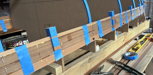 After several weeks of waiting, a single warm day with temps in the 60ºs (F) arrived and I began gluing in the first strips. I'm using staples to hold the strips to the forms and tape along with my clamps to keep the strips aligned and pressed together between forms.