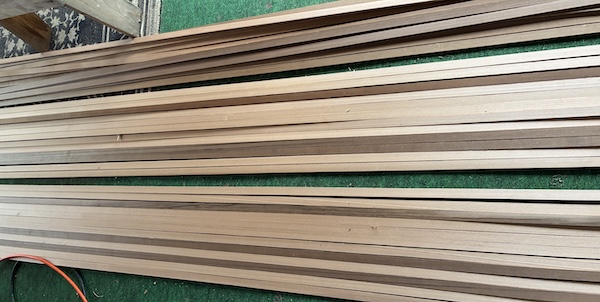 There were 3 distinct colors in the mix. The 15 footers were mostly light but we got 6 dark strips. Then there are several medium-colored 12-foot strips. I've laid out a few to try some possible color schemes.