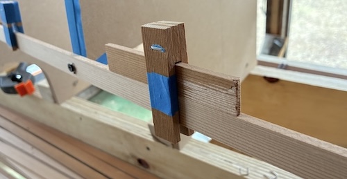 The weather is becoming an obstacle to progress by remaining too cold for gluing. While waiting for the temps to warm up, I made a dozen of these small clamps that slip over two strips to help keep them vertically aligned in the space between forms.
