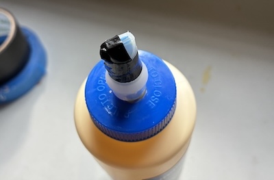 Here I'm trying to limit the amount of glue flow by taping off half of the tip opening.