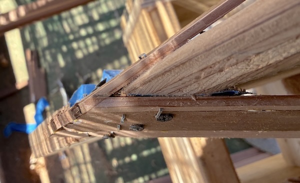 Once all is set for the new strip installation, I run a bead of Titebond 2 glue along the edge of the existing strip. (Taping up half of the glue tip as mentioned earlier works perfectly in controlling the glue flow.)