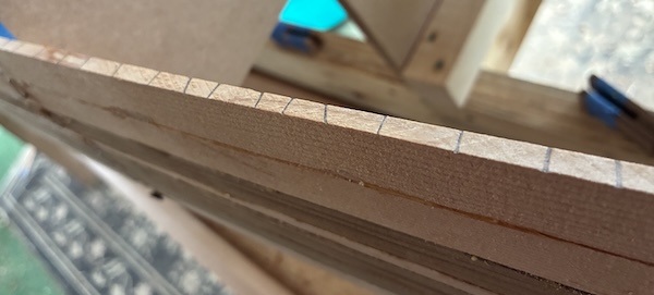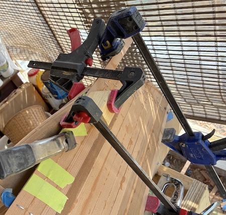 Fortunately a few of my clamps are large enough to still span the width of the strips. When I ran out of blue tape I picked up some 3M Green Tape which supposedly adheres better to rough surfaces – it does seem to work a little better.