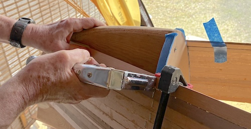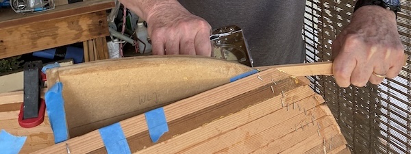 Using a Shinto rasp I file back the stem form and the end of the current strip to create a smooth path for the next strip.
