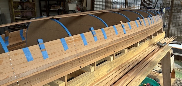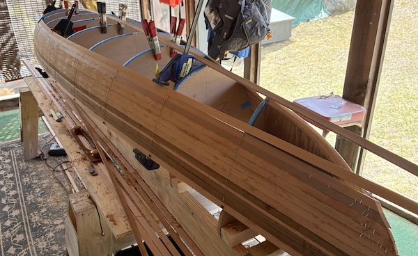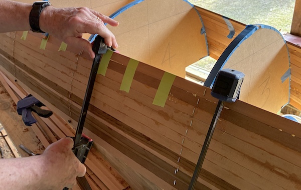 Starting near the center form, I set the next strip in place and clamp it down with a bar clamp. I use my little clamps at various places along the length of the strip to loosely hold the remainder in place and keep it from flopping around.