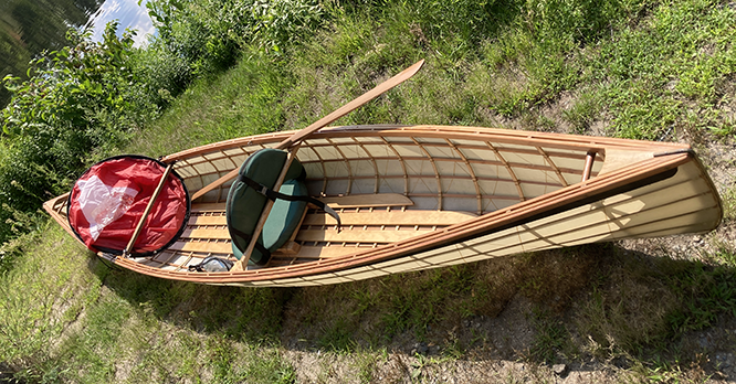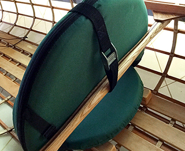 A strap around the seat back and the thwart secure it to the canoe.
