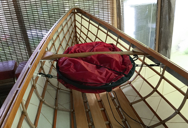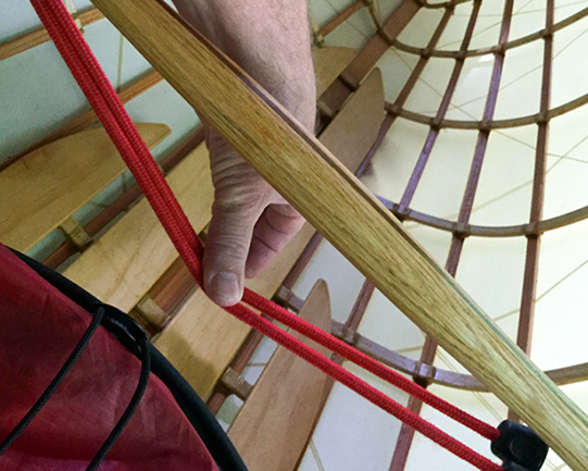 I devised a simple way to install the sail without making any permanent modifications to the frame. A couple loops through the gunwales (one on each side) served as attachment points.