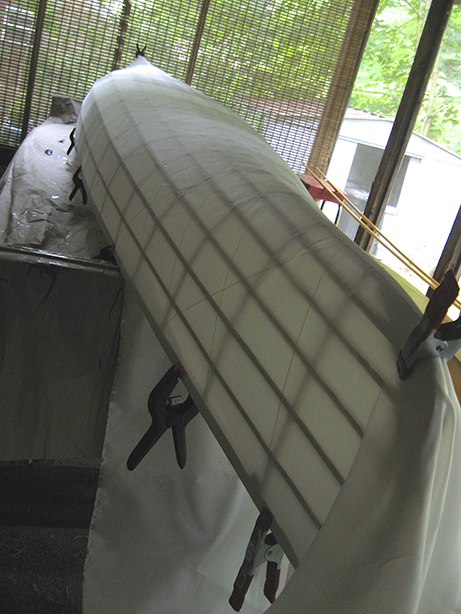 The material is 8 oz. heat-shrinkable polyester cloth purchased from George Dyson. I first spread the material completely over the frame, smoothed it out and clamped it in place to remove any major wrinkles.