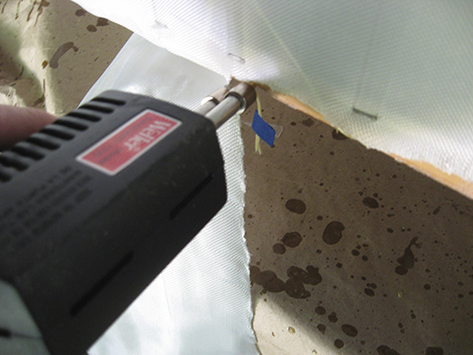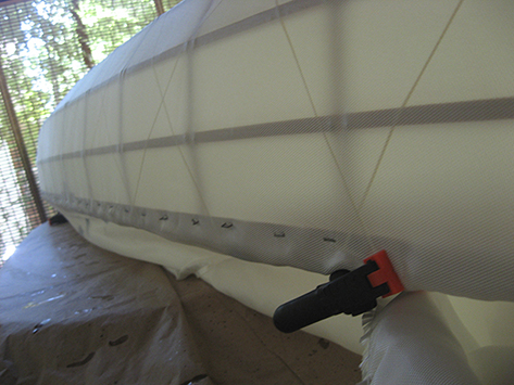 Here a shot taken before the Kevlar roving was trimmed and before the rub rails were reinstalled. The rub rails will hide the staples and the roughly trimmed edge of the cloth.