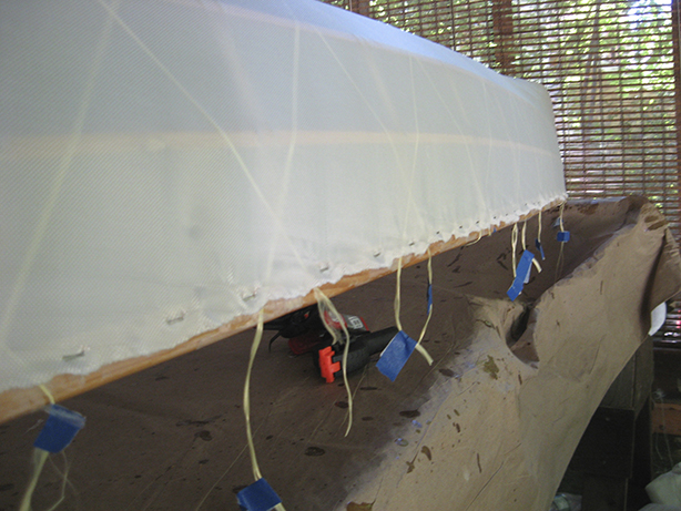 The Kevlar roving is secured between 2 layers of Heat-'n-Bond tape at the gunwales. The tape is heat activated with an iron and adheres as it cools. The Kevlar is comprised of thin strands that tend to bunch up and require repeated smoothing to lay flat.