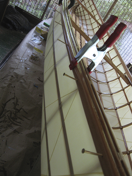 Then, the skin was pulled down tightly and attached along the gunwales with stainless steel staples.