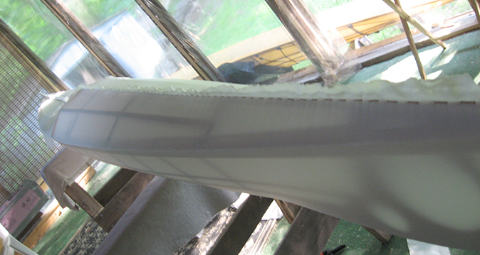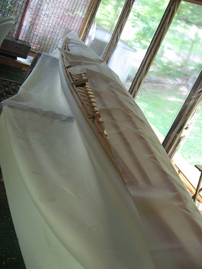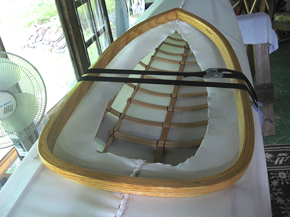 The loose coaming is strapped into position and in the center, the bulk of the extra fabric has been removed.