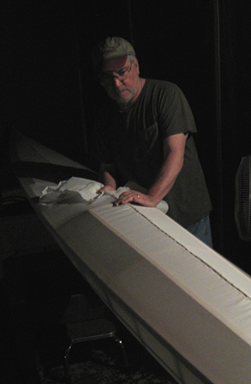 It now becomes a matter of working around the coaming, pulling the skin tight to remove some of those deck wrinkles, securing everything temporarily with nails through the sewing holes and getting a nice, even fold around the top.