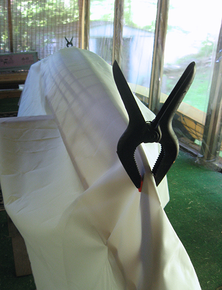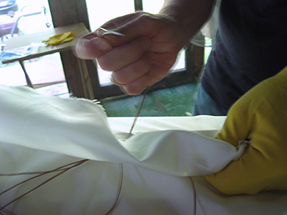 After the skin is streched tight along the bottom and hooked around both end pieces, the frame is flipped right-side-up.