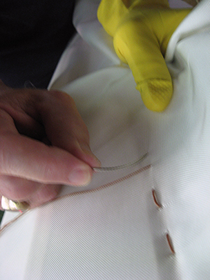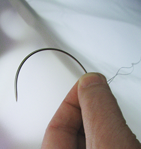Pulling the skin tight between each stitch is rough on the hands. This time I'm prepared with a rubber glove.