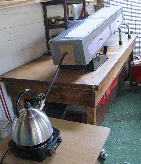 To connect the tea pot to the steam box, I clipped a washing machine hose and snuggly fit it through a hole drilled in a piece of luan plywood.