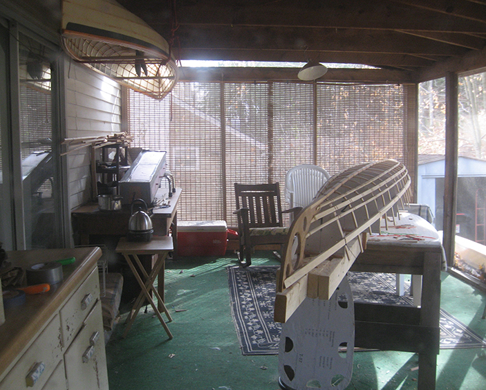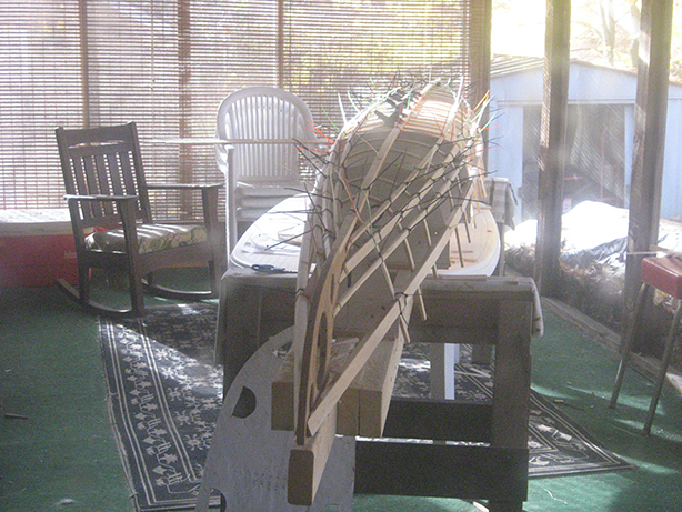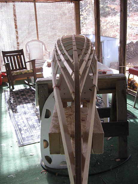 This broom handle temporarily reinforced the keel keeping the ribs flat – a tip from Hillary Russel's book. I wedged other miscellaneous pieces of wood in at various angles to nudge the ribs into smooth, symmetrical shapes as they cooled. More details on how the ribs are bent into place can be seen in the Ribs secion of my Arrow canoe build.