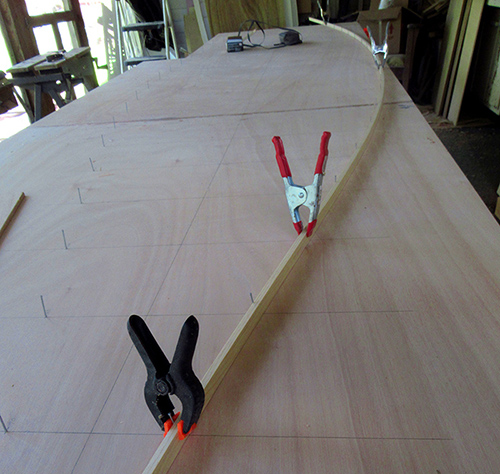 I found a good 16-foot batten in the trim section of the local lumber yard. Here it is clamped to the temporary nails marking each offset point.