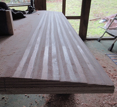 I accurately aligned the panels and temporarily secured them to the underlying support frame at the far ends so the top panel will fall right into place when lowered (it's propped up on this end with scrap 2x4s).
