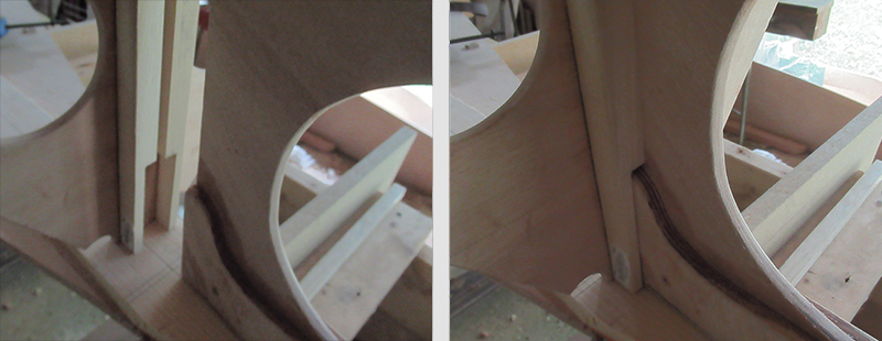 To get started, I used the trim to create interlocking structures at the bow and stern. True alignment is easier at this stage where I can still conveniently draw accurate horizontal and vertical guidelines. The two photos above show the transom and stern web, first apart then assembled – like puzzle pieces.