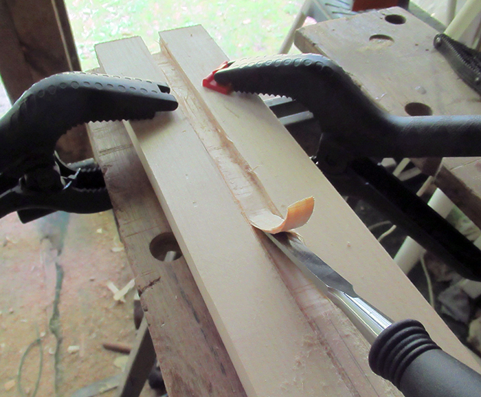 Here I'm making a groove in the floor stem doubler to serve as a drain for the mast step hole.
