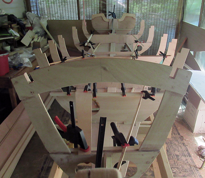 With the stations up, I temporarily clamped inwales in place and determined the location and angle of the inwale notches in the transom. [Edit from the future - it was a bad decision to cut the notches at this time.]