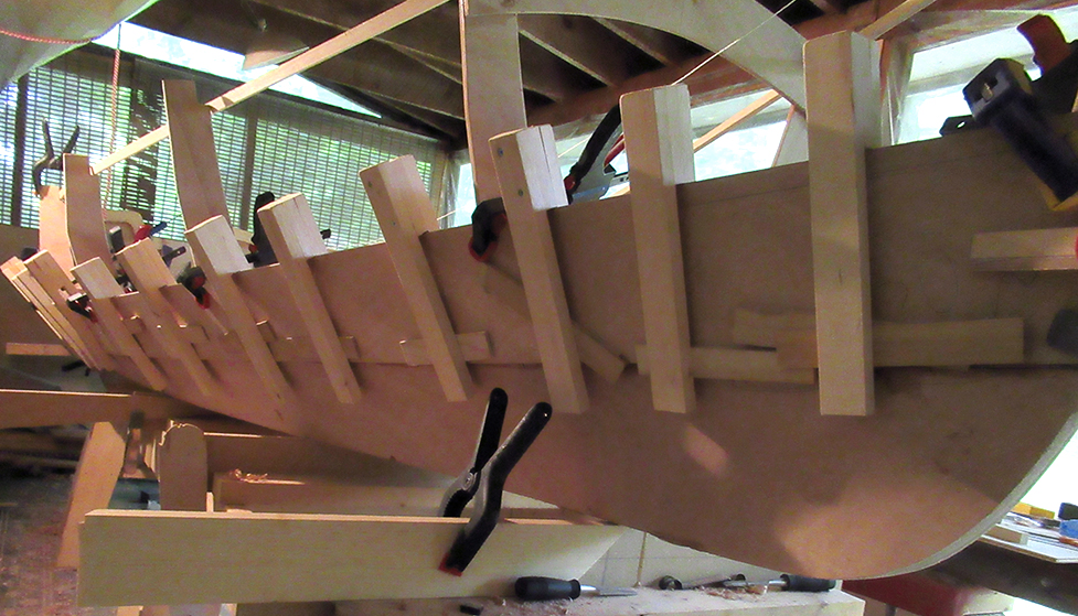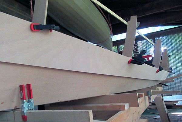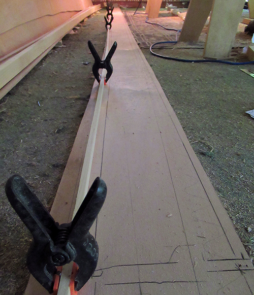 To begin, I've clamped the roughly cut plywood plank into place with the top plotted line lined up to the next corner angle on each station frame.
