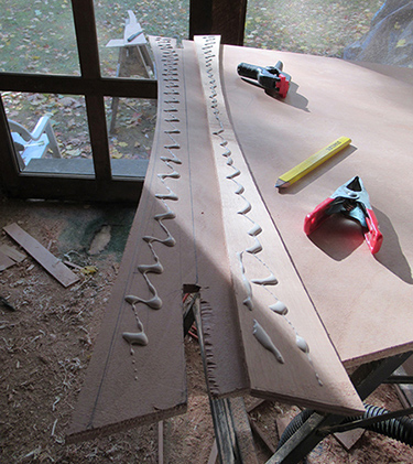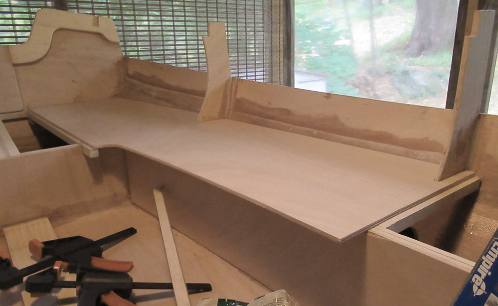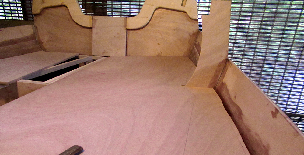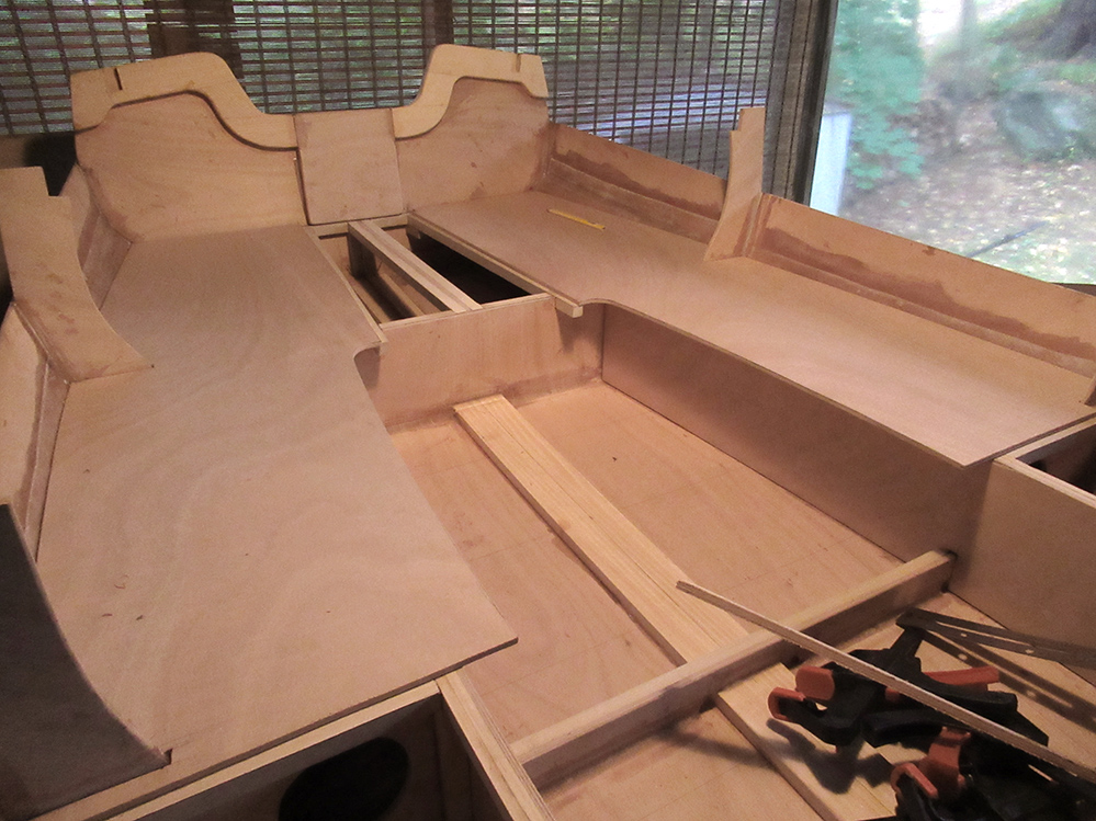 Working on these large plywood seat sections is more manageable when I can spread things out a bit.
