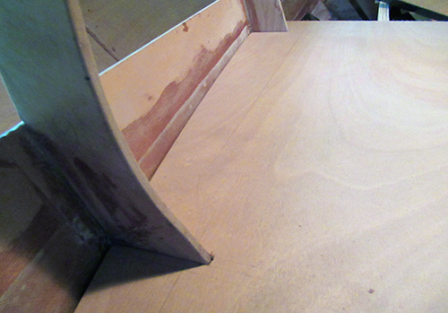Then, using a small block of wood as a spacer, I held a pencil against one side of it and slid the block along the side wall, transferring the shape of the curve onto the plywood. (The pencil line is barely visible in this photo.)