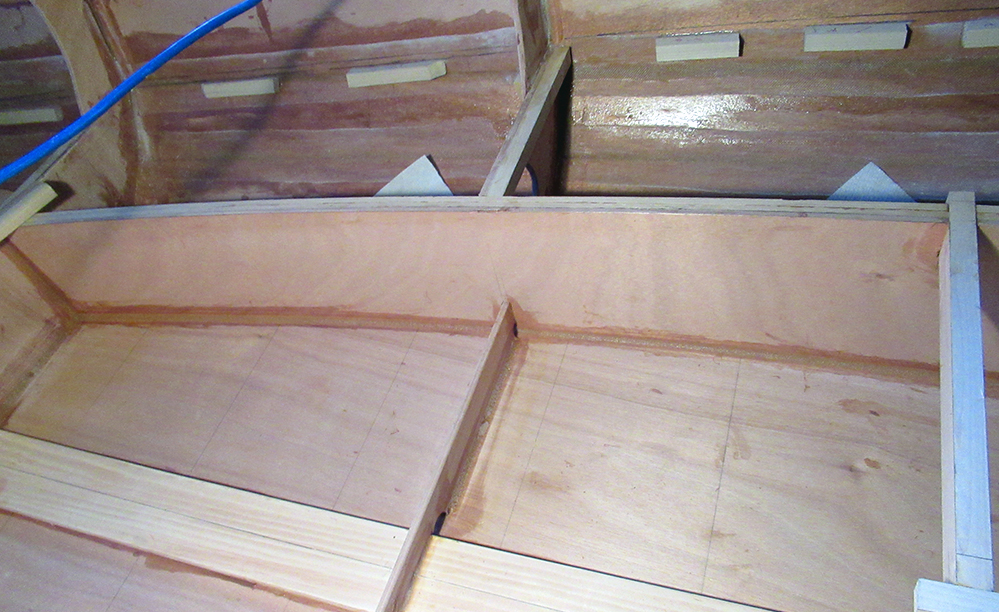 If you look closely you can also see some of the perimeter seat supports needed a little adjusting. I'm gluing in some shims to level things out. I'm also checking the fit of the rough-cut plank 4 on the port side.
