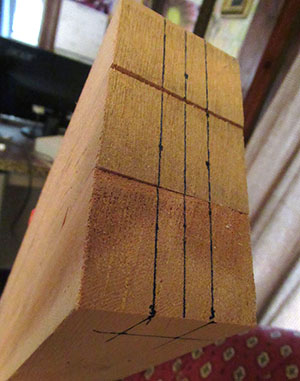 The plans call for a slot, centered at the top of the board to accept an end cap. I decided it would be easier to cut the slot now while I could still use a saw and chisel. Working on 3 boards at a time, I first drew out the slot dimensions...