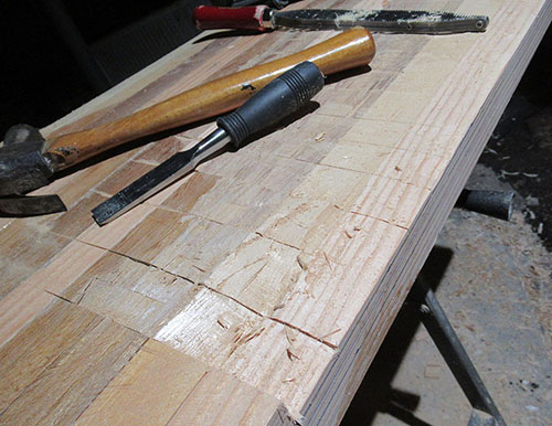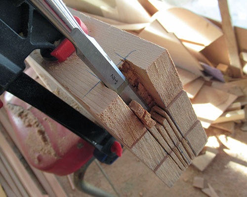 Repeating that cut every inch-and-a-half or so down the length of section to be tapered, I then chiseled from cut to cut to remove the wood.
