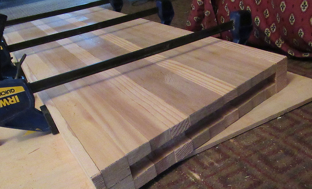 Positioned on top of my old kayak strongback, I raised the ends and clamped down the center section. I will probably need steam or heat for the final shape, but this may provide a bit of assistance.