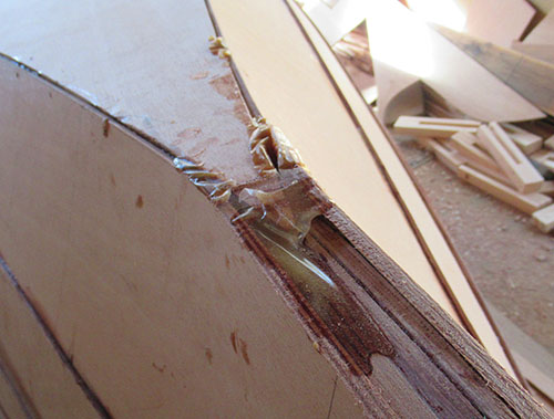 Here is the first surprise: a good look at the bottom of the bow where I had poured the thickened epoxy. It looks like a disaster here but...