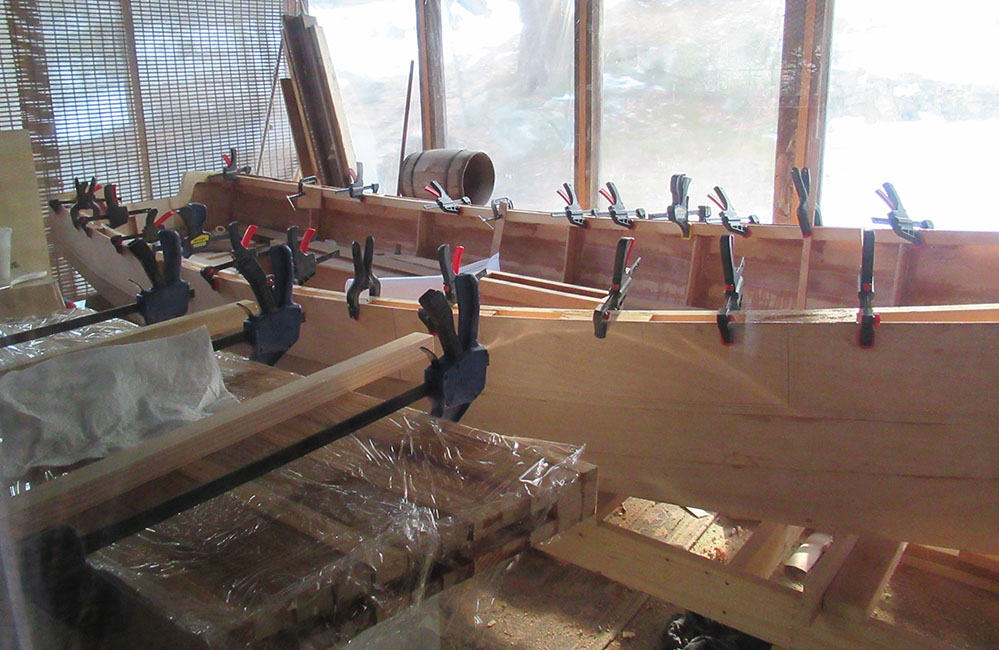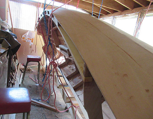 I had the outer gunwales clamped in place for a couple weeks and found they retained some of their horizontal bend when I unclamped them. That gave me the idea to try to add a little vertical bend. (lower part of photo.)