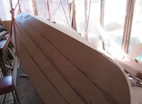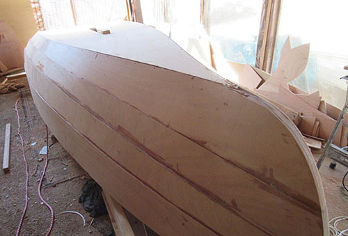 I'll be taping the seams, filleting the laps, fiberglassing the bottom, installing the keel and painting the hull before flipping it right side up again.
