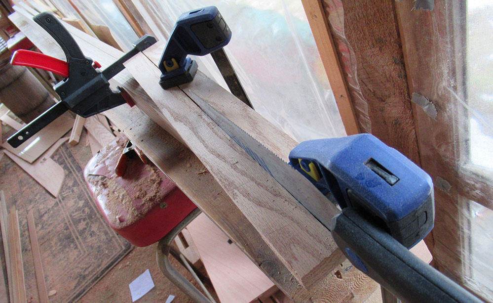 Back on the porch I started cutting the scarfs for the outer gunwale rubrails. I set up this jig for an eight-to-one angle and started by clamping a board on top of the stock, angled to align to the pencilled scarf guideline. Then placed the saw right on the line and slid a second guide board in place. The guides kept the saw vertical and at the correct angle while sawing through the stock.