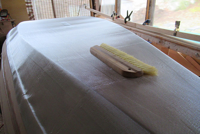 But the biggest project this weekend was fiberglassing the bottom. I first laid out the cloth, roughly trimmed the edges, then smoothed the wrinkles out with this stiff brush.