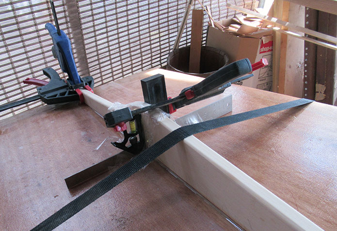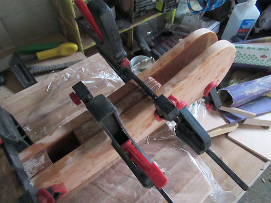 I added silica and a little wood flour to the epoxy and put it on extra thick. Here's the basic clampdown setup.