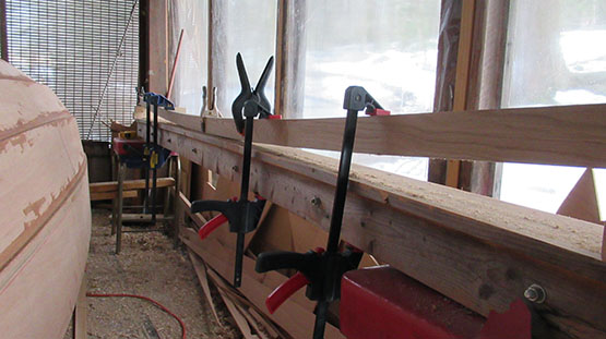 Picking up from last weekend, the beveling is now complete on the outwales and they're back in clamps in an attempt to coax a little pre-bend in them.