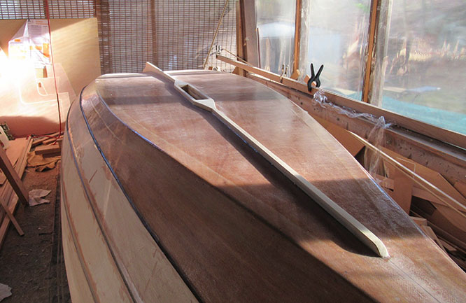 Between epoxy rounds I beveled the outwales – they go from 60mm wide in the center to 50mm at each end. Here I'm laying out some guide lines.