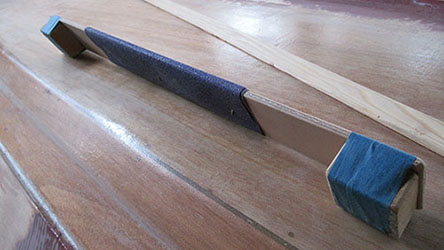 The next morning the fairing was completely set up, so I put together this sanding block to sand the curved strakes. It's made from flexible plywood with a couple handles screwed on (the tape is covering the screw heads).