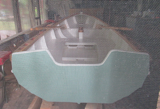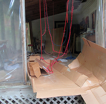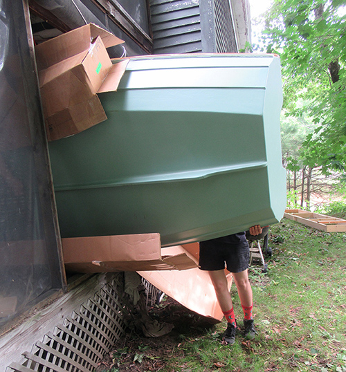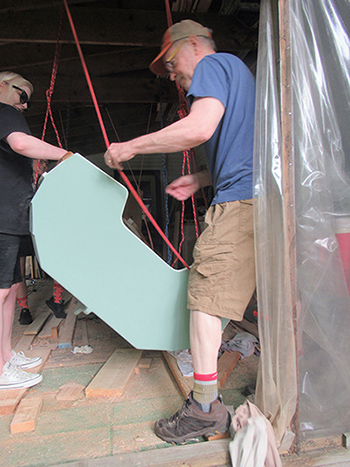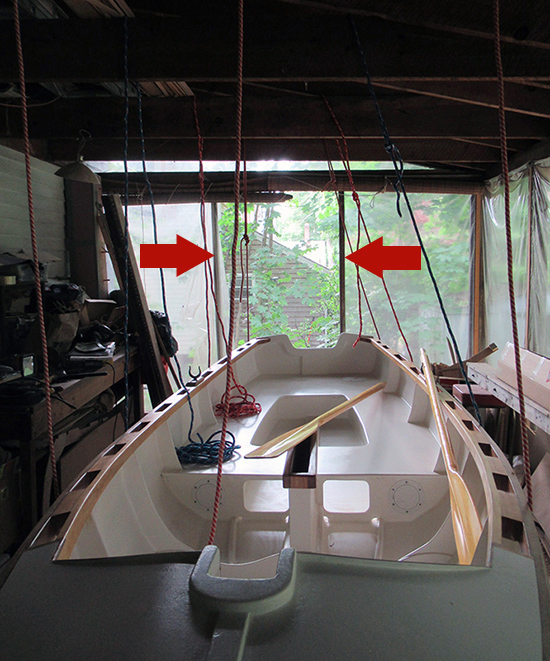 The only reasonable way out is to remove a portion of the screen, turn the boat on its side and squeeze it through the opening (the section between the two arrows in the photo — yes, it will fit). Again, ropes over the rafters will hopefully assist with the operation. (Note the oars arrived this week!)