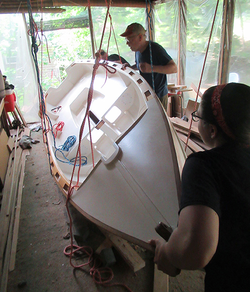 Here we're adjusting the lines after first raising the hull slightly to slip the underlying supports out.